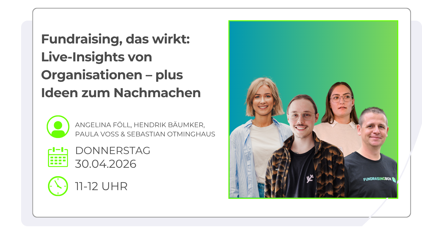 Unsere Live-Webinare geben Dir frische Impulse für Dein Fundraising – von aktuellen Trends bis zu praxisnahen Best Practices. Alles online, kompakt und interaktiv: Stelle Deine Fragen direkt an unsere Expert*innen und tausche Dich mit anderen Teilnehmenden aus.
